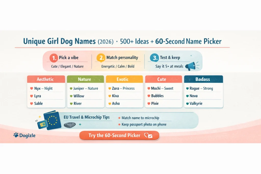 Infographic — How to pick a unique girl dog name in 60 seconds: quick steps, category picks, meanings, and EU microchip & travel tips.